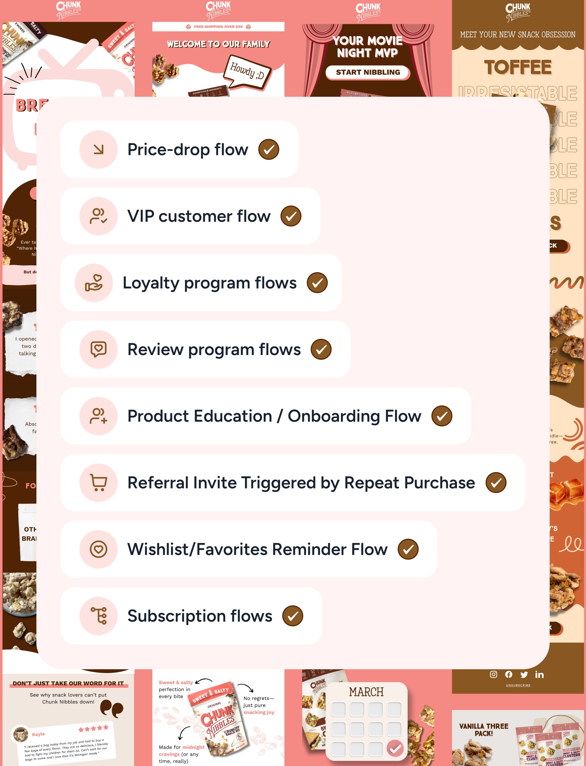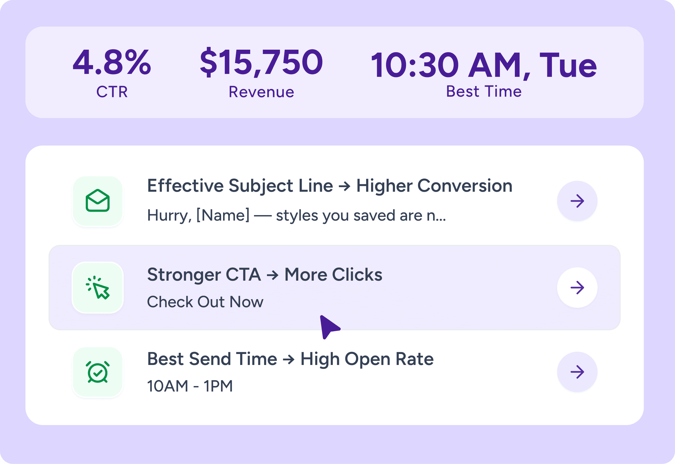 Closes the loop on opens, clicks, and revenue to improve product picks, cadence, and creative every cycle.